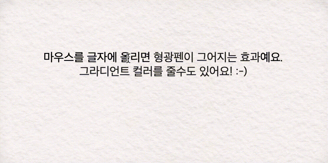 <div class="wrap">마우스를 글자에 올리면 <a href="#" class="highliter yellow"><span>형광펜이 그어지는 효과</span></a>예요. <a href="#" class="highliter gradient"><span>그라디언트 컬러를 줄수도 있어요! :-)</span></a></div>