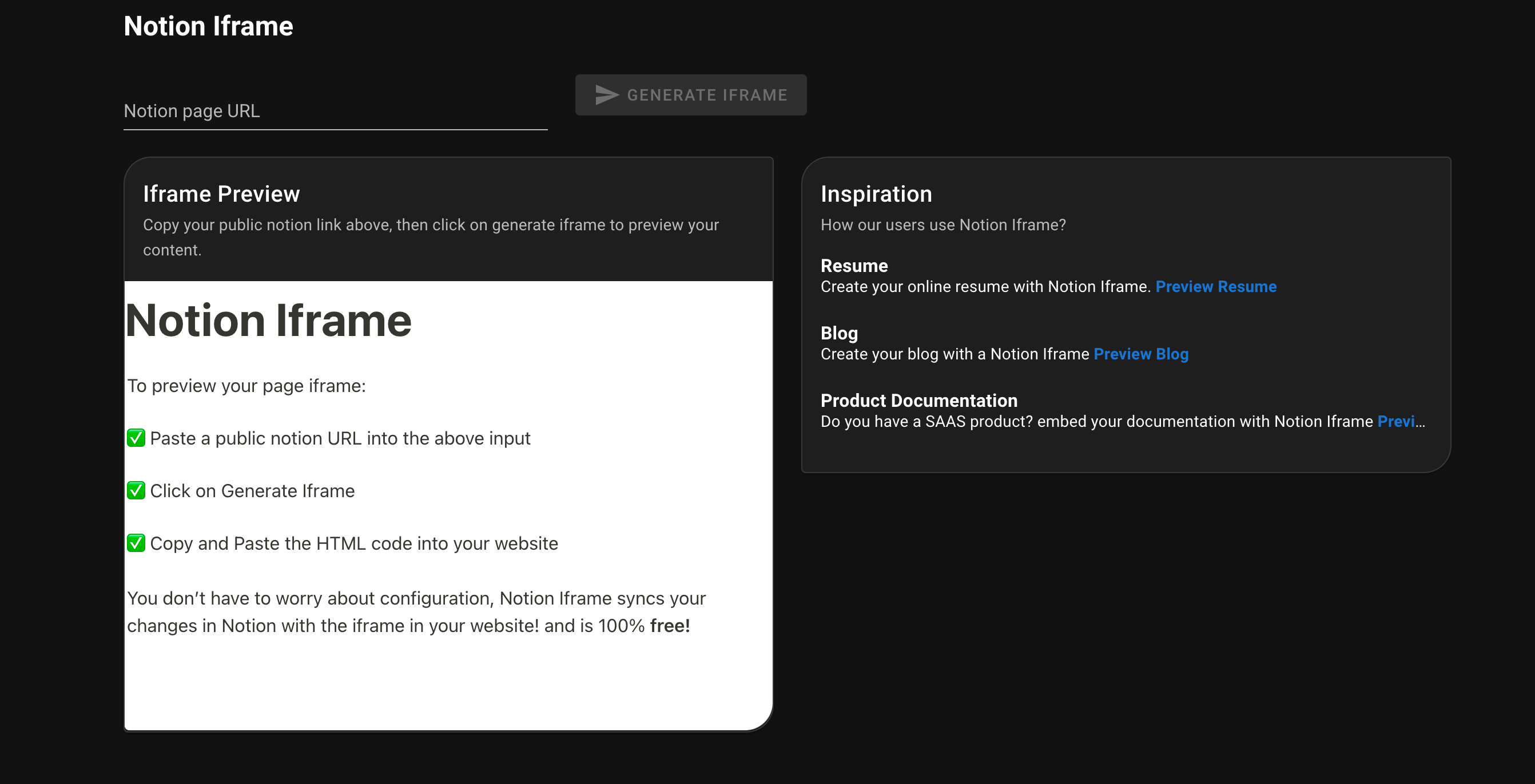 "generates a new URL for the notion page and the iframe HTML to include it in any other page." 라는 문구를 보면