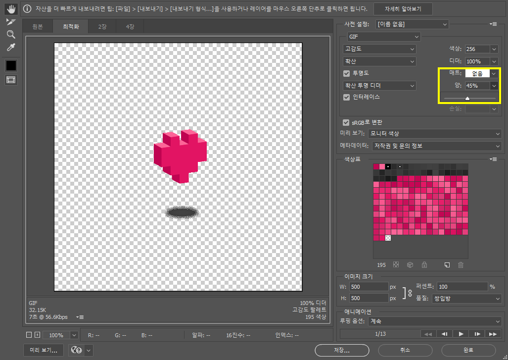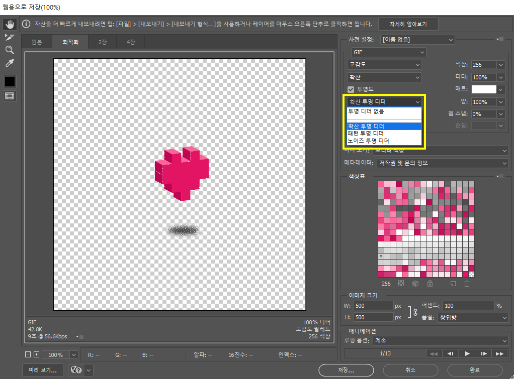 이때 몇가지 설정을 수정하여 내보내면 조금은(?) 나은 상태의 gif 투명 이미지를 만들 수 있습니다
