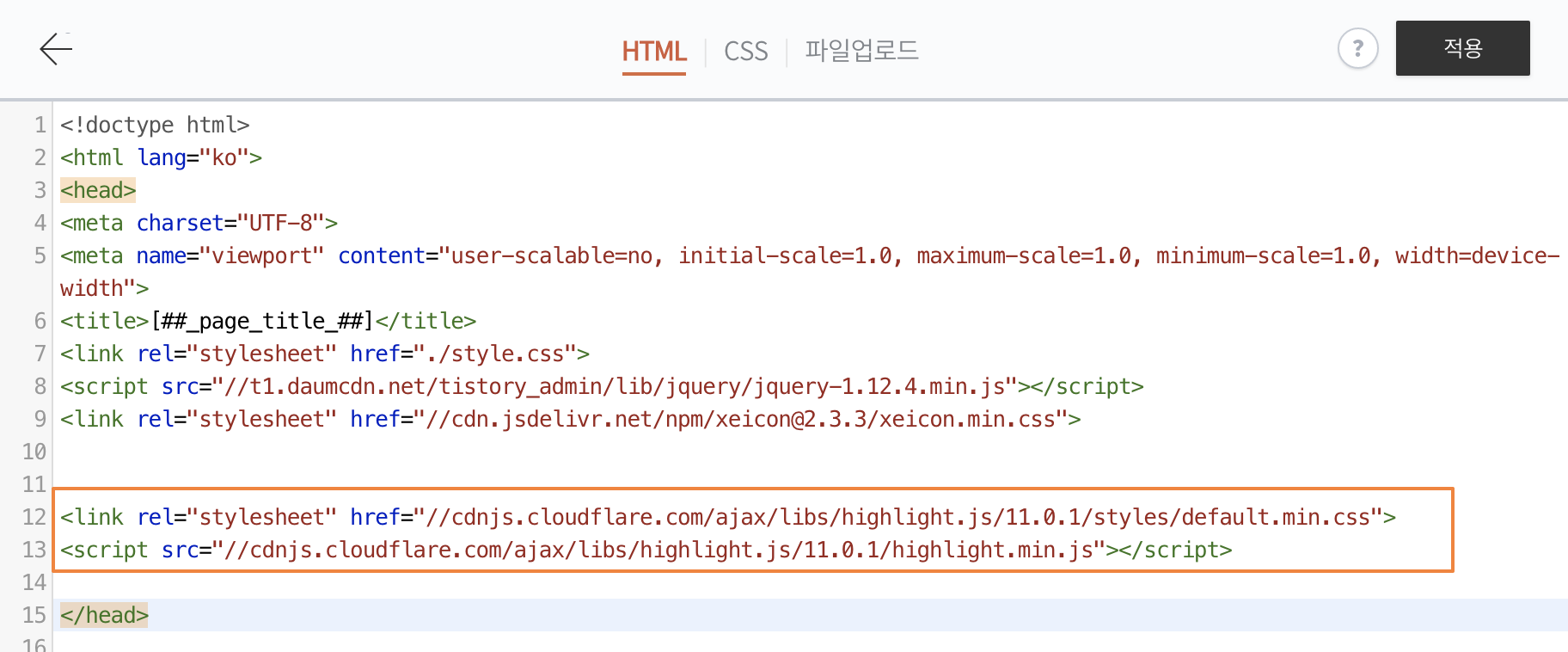 4. Head 사이에 복사한 내용 붙여 넣고 적용
